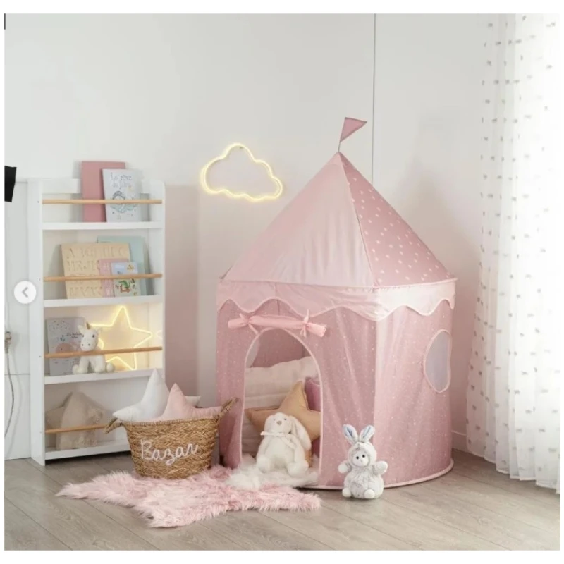 Za igranje princeze pastelno ružičasti šator idealan je dar za djecu koja vole izmišljati lijepe priče. Ima otvor na prednjoj strani koji se pričvršćuje uzicama i okvir sa zastavicom. Praktičan, možete ga jednostavno transportirati i pohraniti zahvaljujući torbi. Sa svojim lijepim zlatnim točkastim uzorcima, ovaj šator za igru pružit će profinjen i nježan dodir u spavaćoj sobi vašeg djeteta.