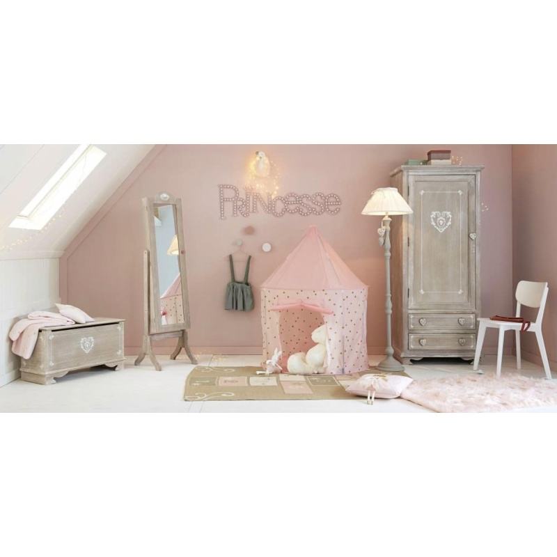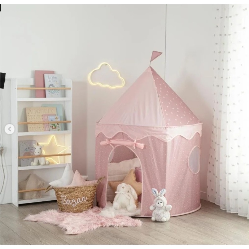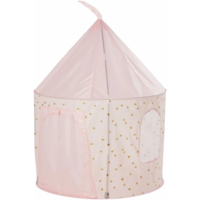 Za igranje princeze pastelno ružičasti šator idealan je dar za djecu koja vole izmišljati lijepe priče. Ima otvor na prednjoj strani koji se pričvršćuje uzicama i okvir sa zastavicom. Praktičan, možete ga jednostavno transportirati i pohraniti zahvaljujući torbi. Sa svojim lijepim zlatnim točkastim uzorcima, ovaj šator za igru pružit će profinjen i nježan dodir u spavaćoj sobi vašeg djeteta.