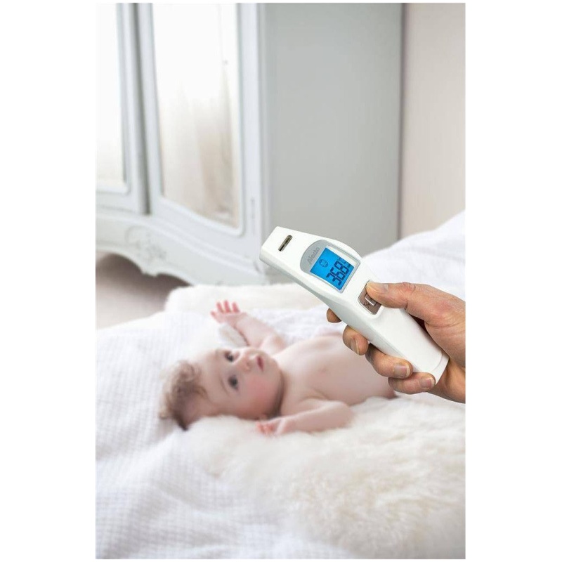 Ovaj termometar mjeri temperaturu vašeg djeteta na čelu. Mjerenje je brzo i jednostavno, a zaslon možete postaviti na stupnjeve Celzijusa ili Fahrenheita. Ako se temperatura vašeg djeteta digne iznad 37 °C (ili 98,6 °F), infracrveni termometar će vas obavijestiti na nekoliko načina: čut ćete zvuk, zeleno svjetlo će zasvijetliti crveno, a na zaslonu ćete vidjeti očitanu temperaturu , tako da čak i oni koji ne znaju točno koja temperatura označava groznicu mogu koristiti ovaj termometar bez napora.