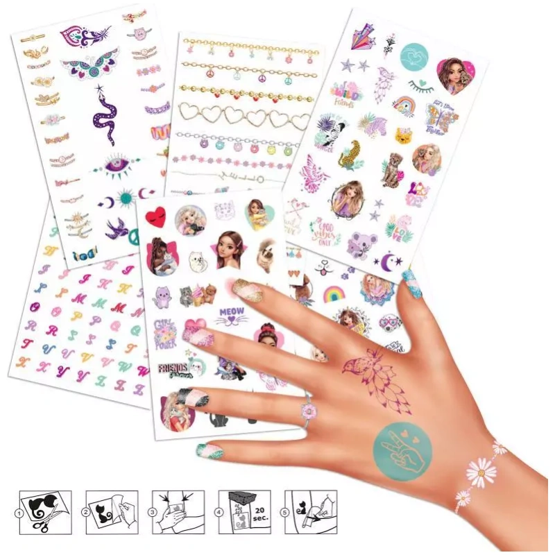 Samo treba malo vode i lako se nalijepe na kožu, Top Model Tetovaže su apsolutno bezbolne i sigurne za upotrebu. Svaka tetovaža traje nekoliko dana, tako da možeš eksperimentirati s različitim dizajnima i mijenjati svoj izgled koliko god puta želiš. Budi kreativan i istakni svoju ličnost!