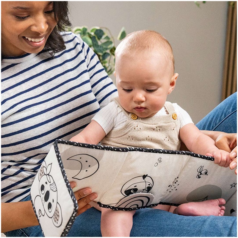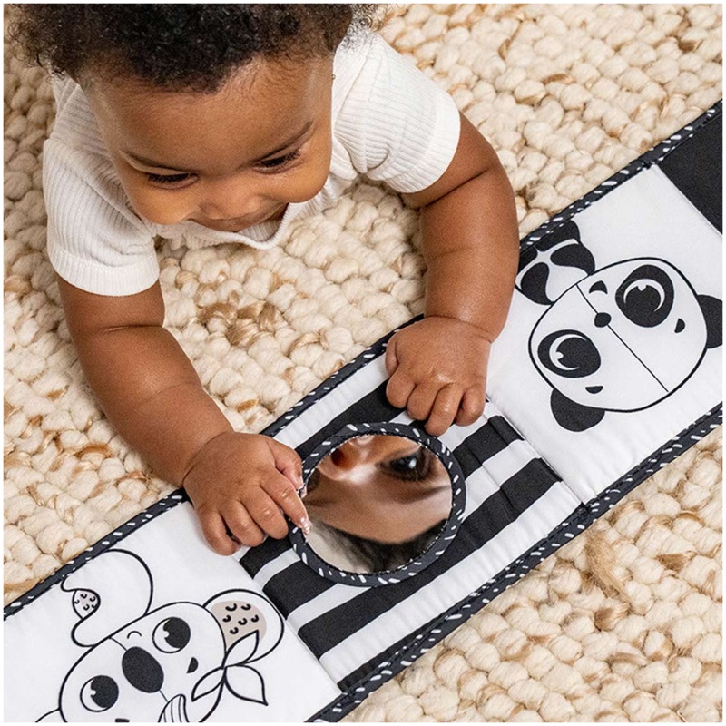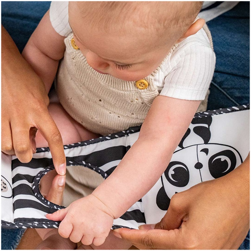 Svojim kontrastnim crno-bijelim dizajnom na jednoj strani, ova knjiga potiče vizualni razvoj mlađih beba. Kontrastni oblici i ogledalo privlače pažnju i pomažu bebama da se usredotoče na fokusiranje pogleda. S druge strane, umirujući obojeni prizori i simpatični likovi oduševit će starije bebe.