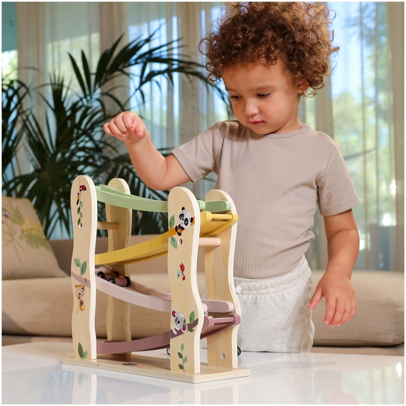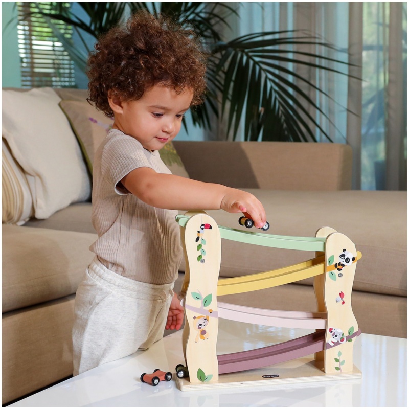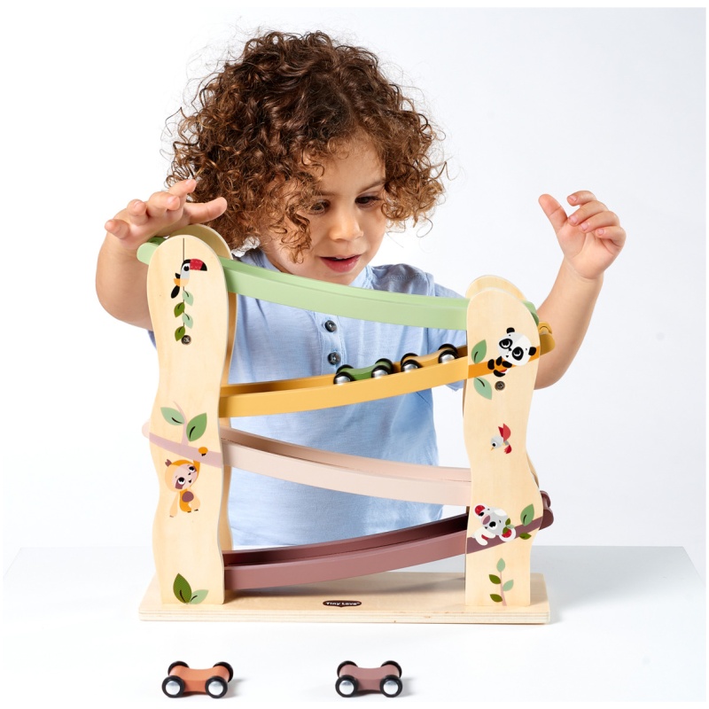 Sa svojim dizajnom inspiriranim prirodom, rampa i njezina 4 autića za jednostavno rolanje uče mališane čudu gravitacije i kretanja.