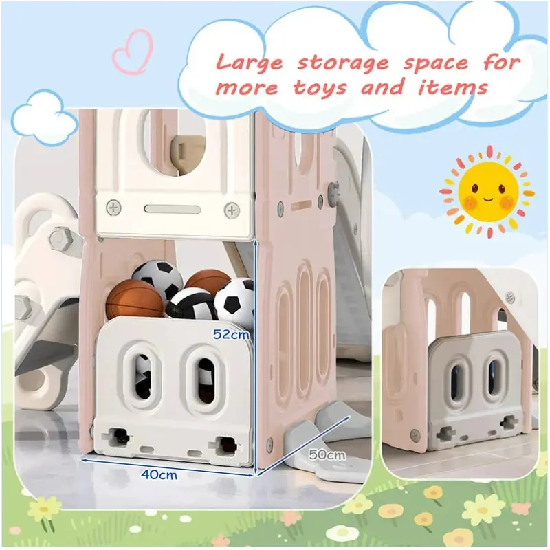 Ali to nije sve! Ovaj tobogan nudi čak šest aktivnih zona, uključujući stepenice, klizalište, prostor za košarku, mjesta za skrivanje, pa čak i prostor za bacanje prstena. Vaša djeca će razvijati motoričke vještine, ravnotežu i koordinaciju kroz penjanje, skakanje i klizanje na ovom izuzetnom igralištu.