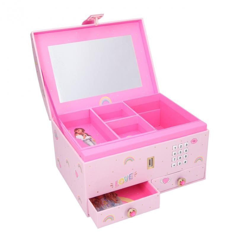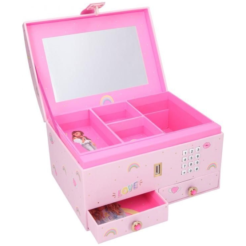 Ova luksuzna kutija je posebno dizajnirana za čuvanje vašeg nakita na elegantan način. Odaberite svoj jedinstveni kod i zaključajte svoje blago. Svaki put kad otvorite kutiju kucanjem tajnog koda, otkrit ćete nešto posebno – kutija će započeti svirati omiljenu TOP MODEL glazbu.