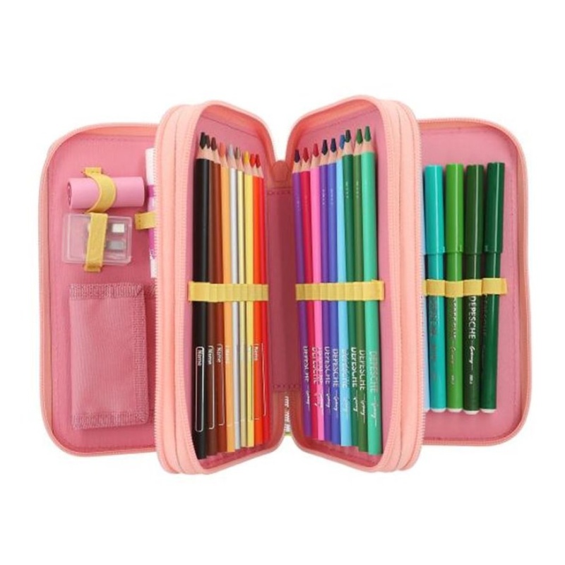 S tri odvojena pretinca, svaki je ispunjen bogatim izborom kreativnog pribora: 18 bojanki i flomastera vrhunske kvalitete, dvije pouzdane olovke, šiljilo, gumica, ravnalo, škare, ljepilo i praktična mala vrećica na čičak. Sve što je potrebno za pretvaranje ideja u umjetnost nalazi se na dohvat ruke!