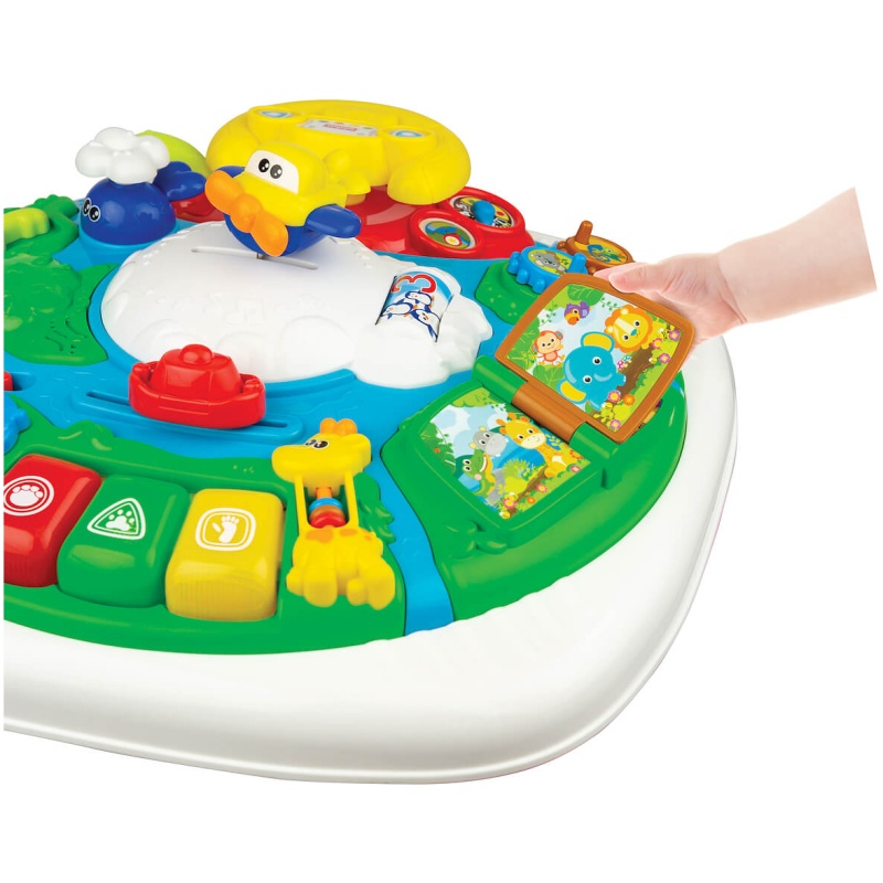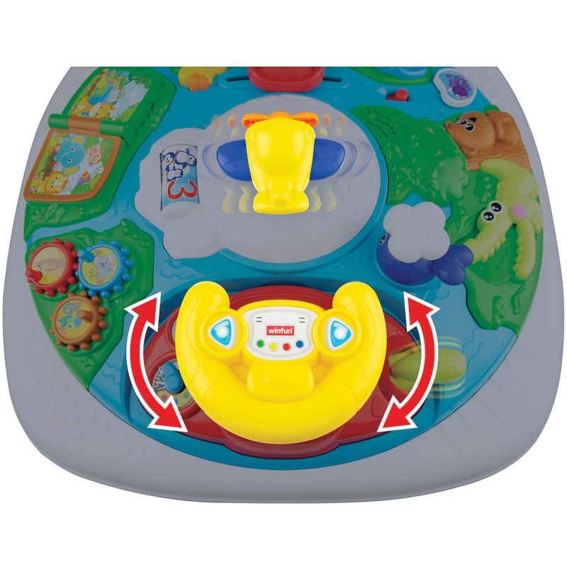 Ova ploča nudi mnogo zabave i učenja. Zahvaljujući upravljaču i avionu, dijete može aktivno upravljati letjelicom i okretati propelere. Pored upravljača nalazi se poluga sa zvukom i indikatorom brzine. Valjak s matematičkim brojevima i likovima upoznaje dijete s osnovama matematike. Tri velika gumba s svjetlima i melodijama pružaju dodatnu zabavu i stimulaciju.