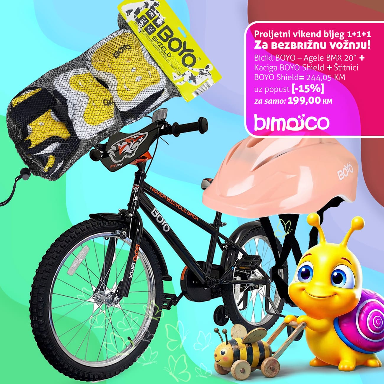 U ponudi se nalaze Bicikl BOYO Agele BMX 20″, Kaciga BOYO Shield i Štitnici BOYO Shield. To je odlična kombinacija za početak, jer ne donosi samo zabavu, nego i važan osjećaj sigurnosti pri učenju i svakodnevnoj vožnji.