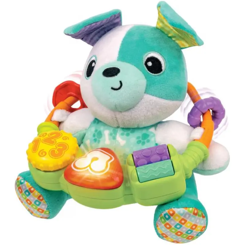Sa svojim odvojivim prstenom za aktivnosti, ovaj psić nudi svijet interaktivne igre. Šareni prsten za aktivnosti ima valjke, klizni biser i vrtešku, pružajući beskrajne mogućnosti za vaše dijete da istražuje i otkriva. Dok manipuliraju različitim elementima, njihove fine motoričke vještine će se poboljšati, dok uzbudljive boje i teksture potiču njihove osjete.